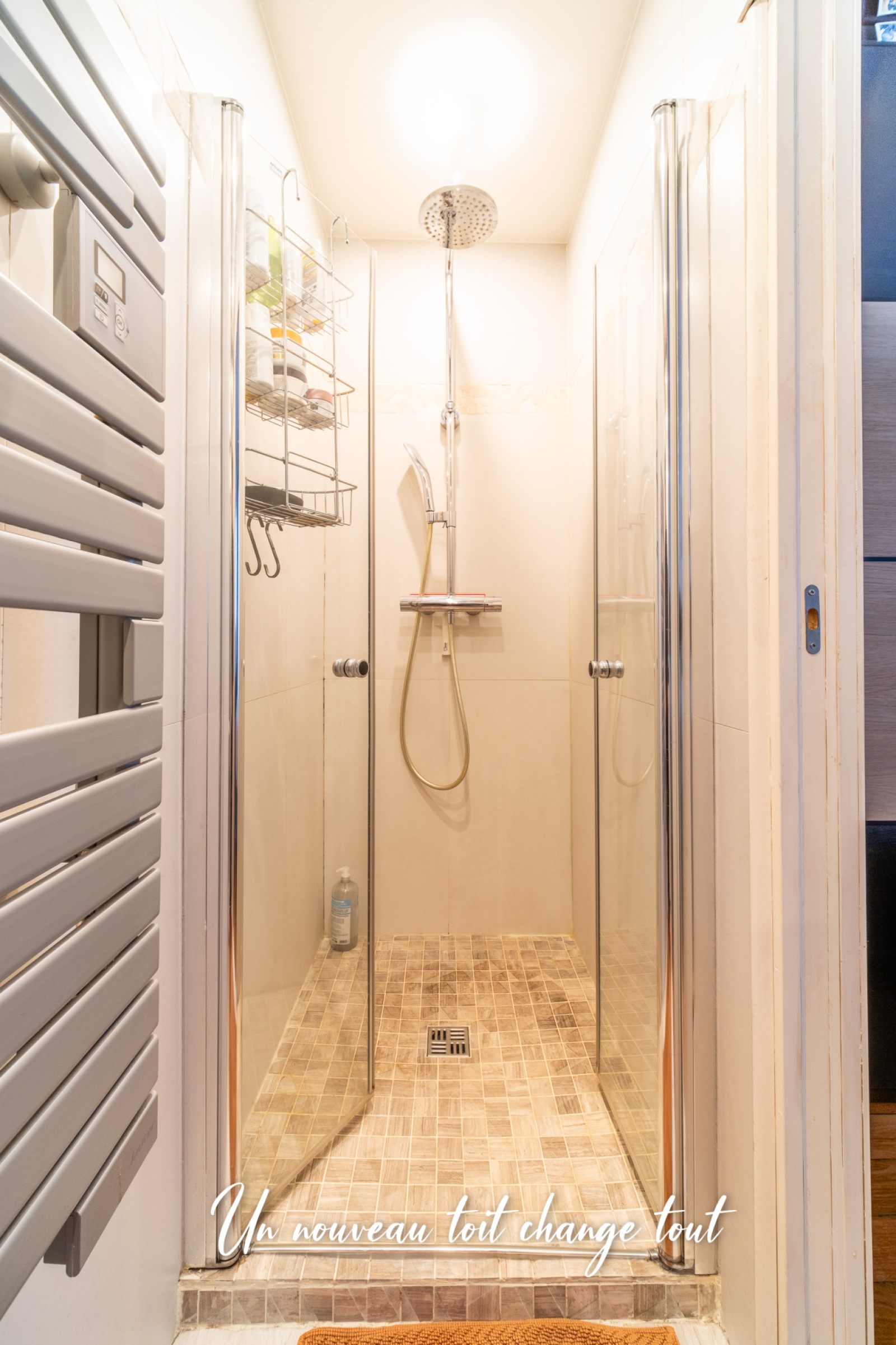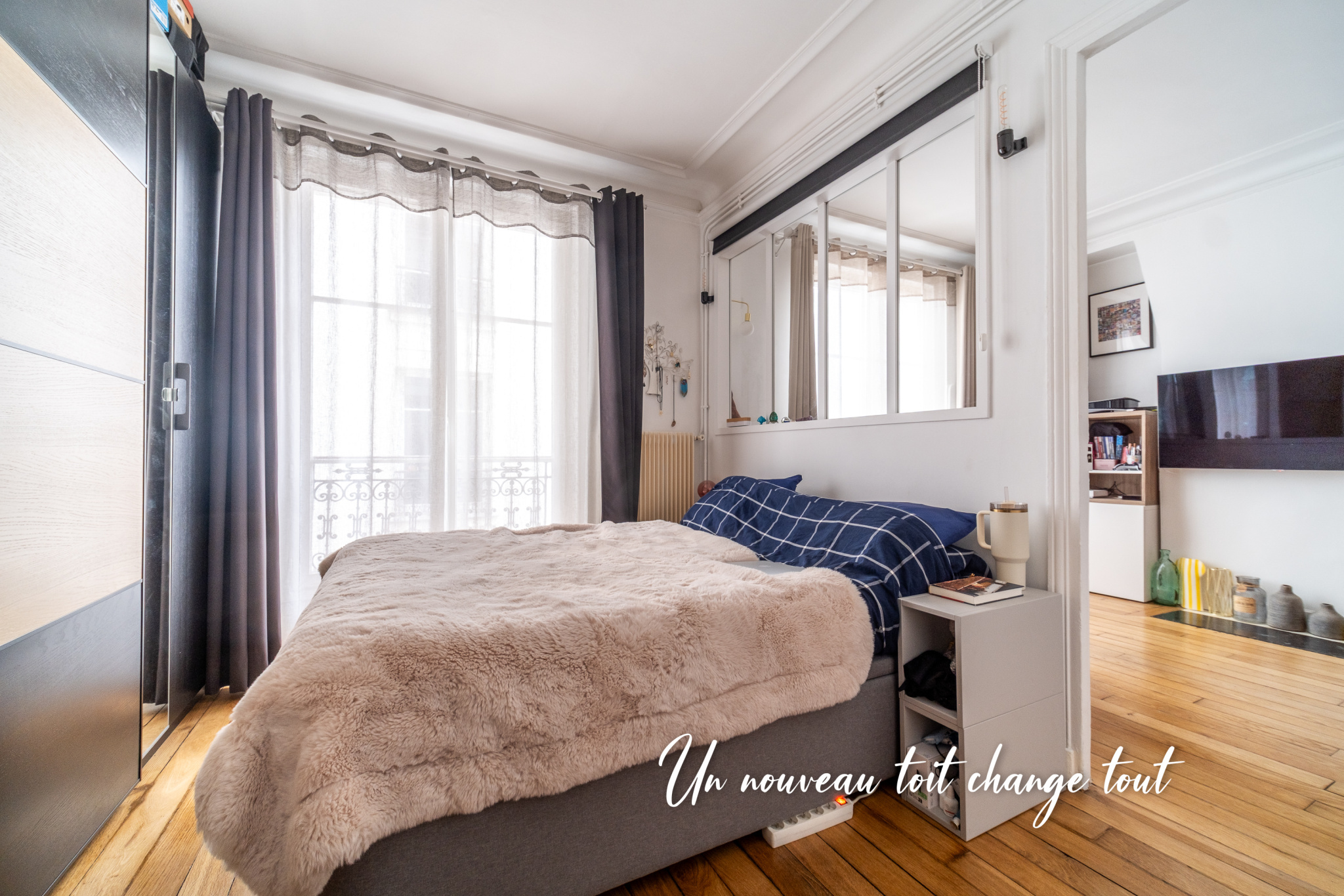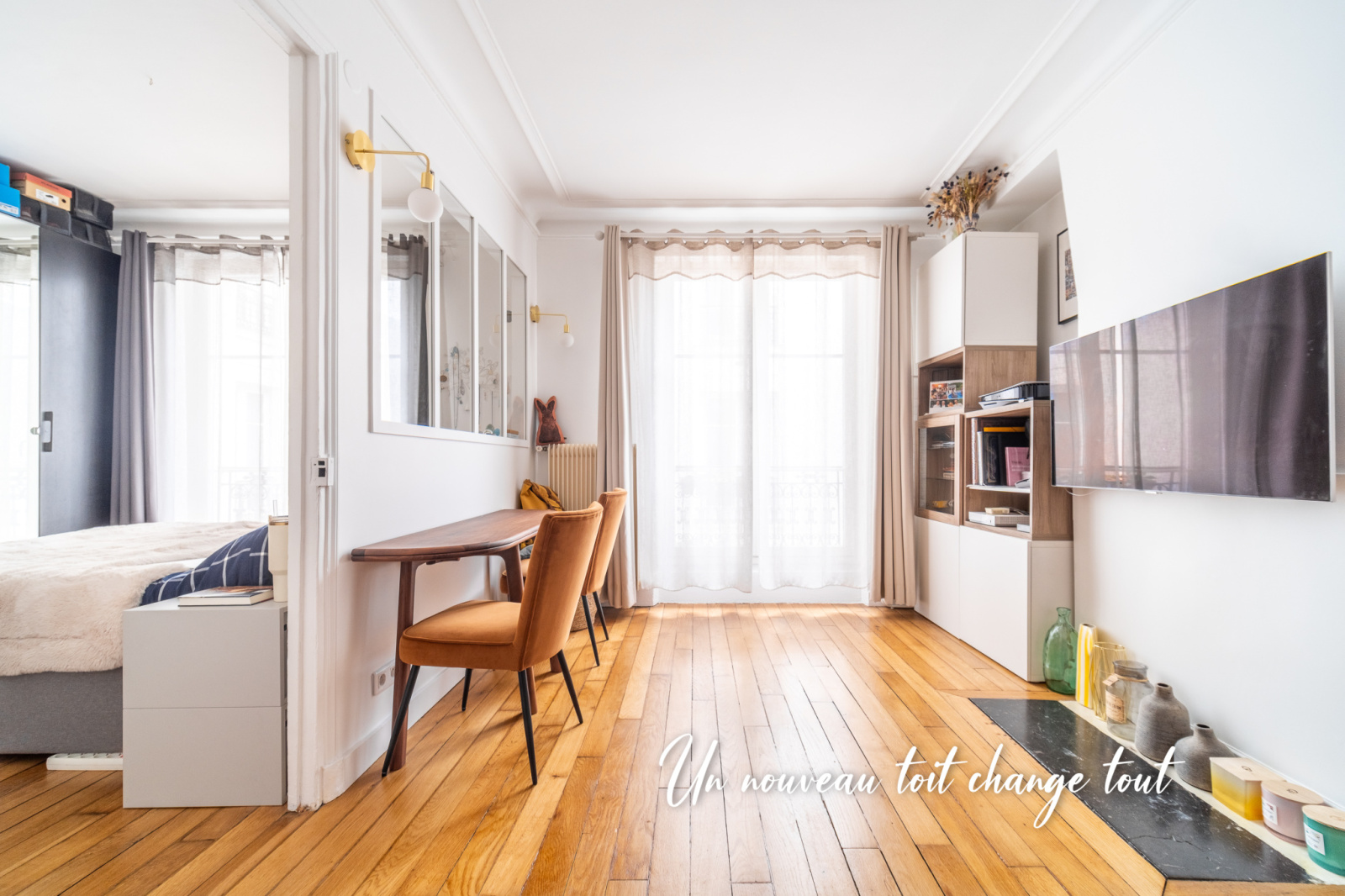 La sensation d'espace est magnifiée par la belle hauteur sous plafond et la verrière entre le séjour et la chambre.