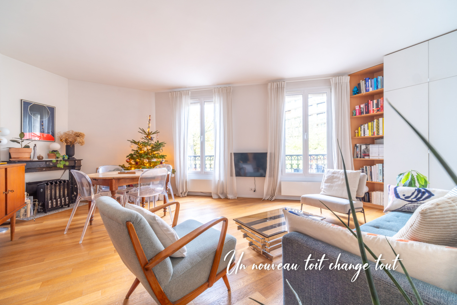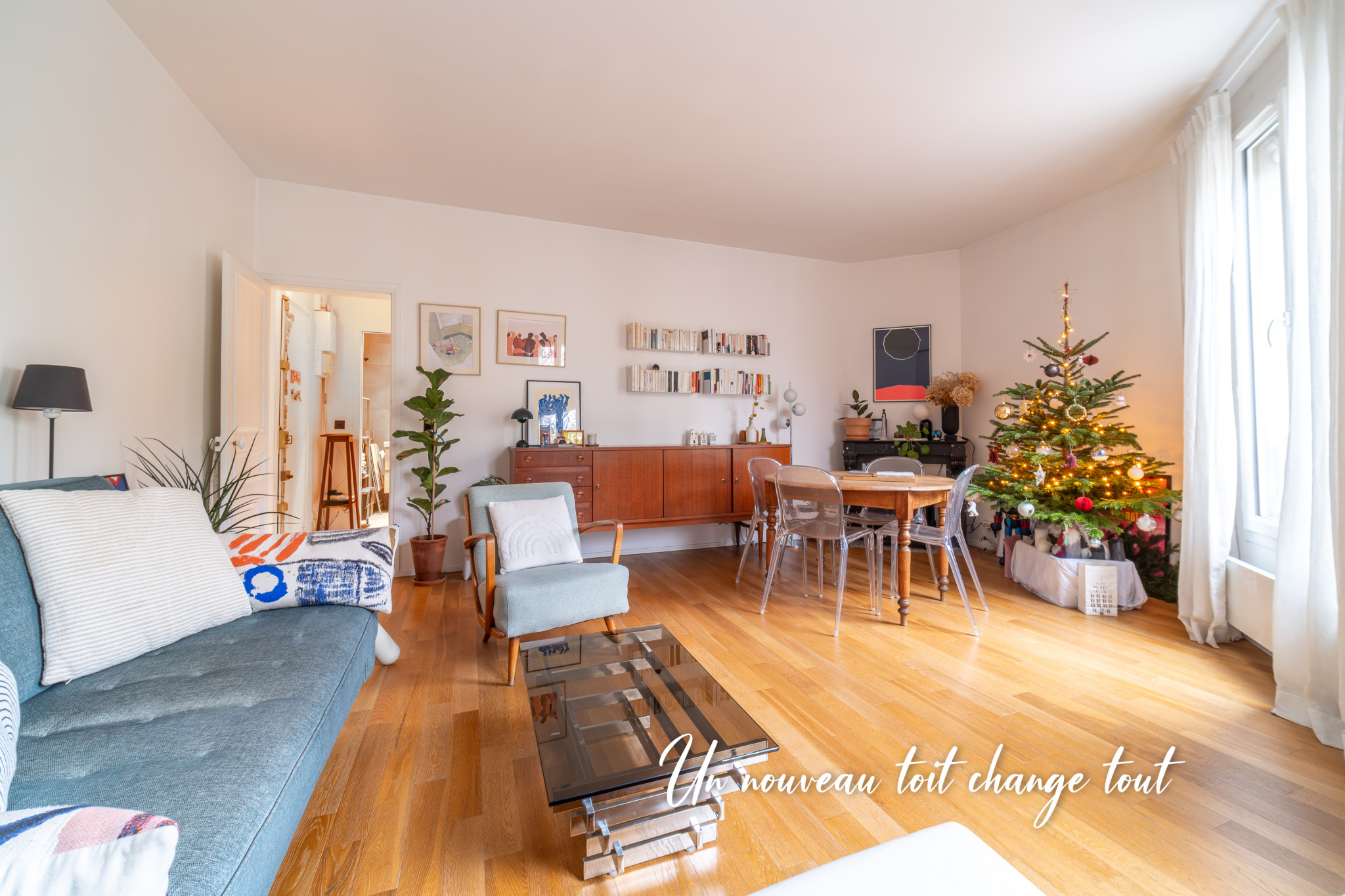 Le séjour, d’une surface de 25 m², profite de deux fenêtres orientées Sud-Ouest, offrant un soleil généreux tout au long de l’après-midi et une réelle sensation d’espace.