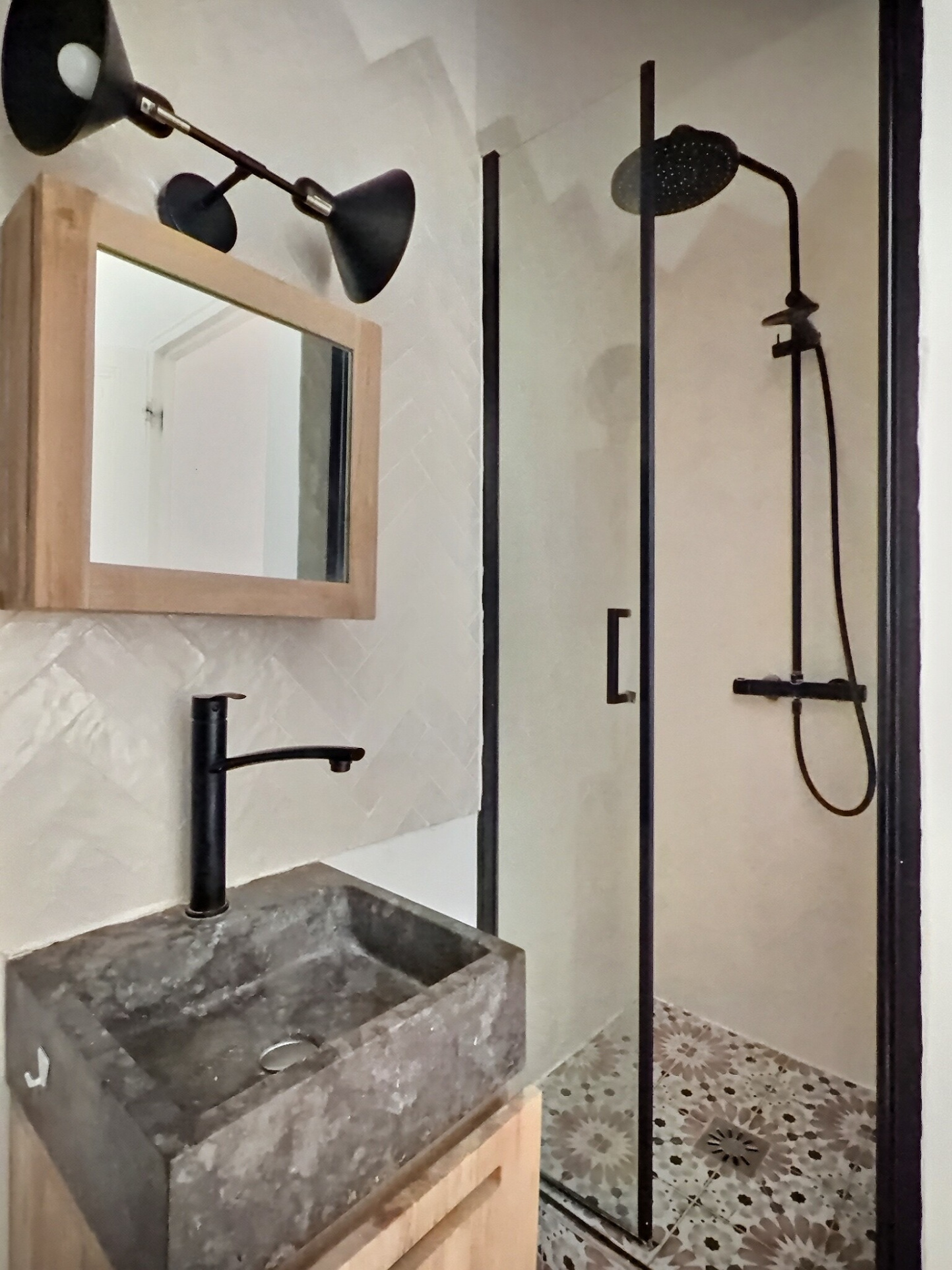 Dans le prolongement, une chambre confortable avec sa salle d’eau ouverte, créant un espace nuit intime et agréable.