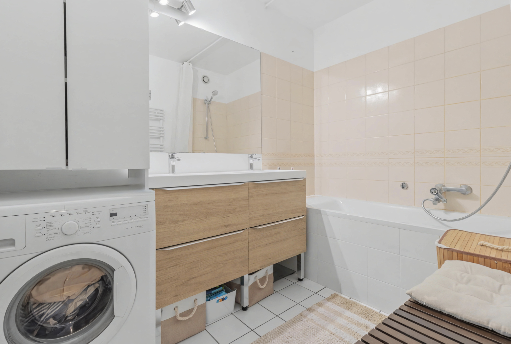 - d’une salle de bains élégante avec baignoire et double vasque,