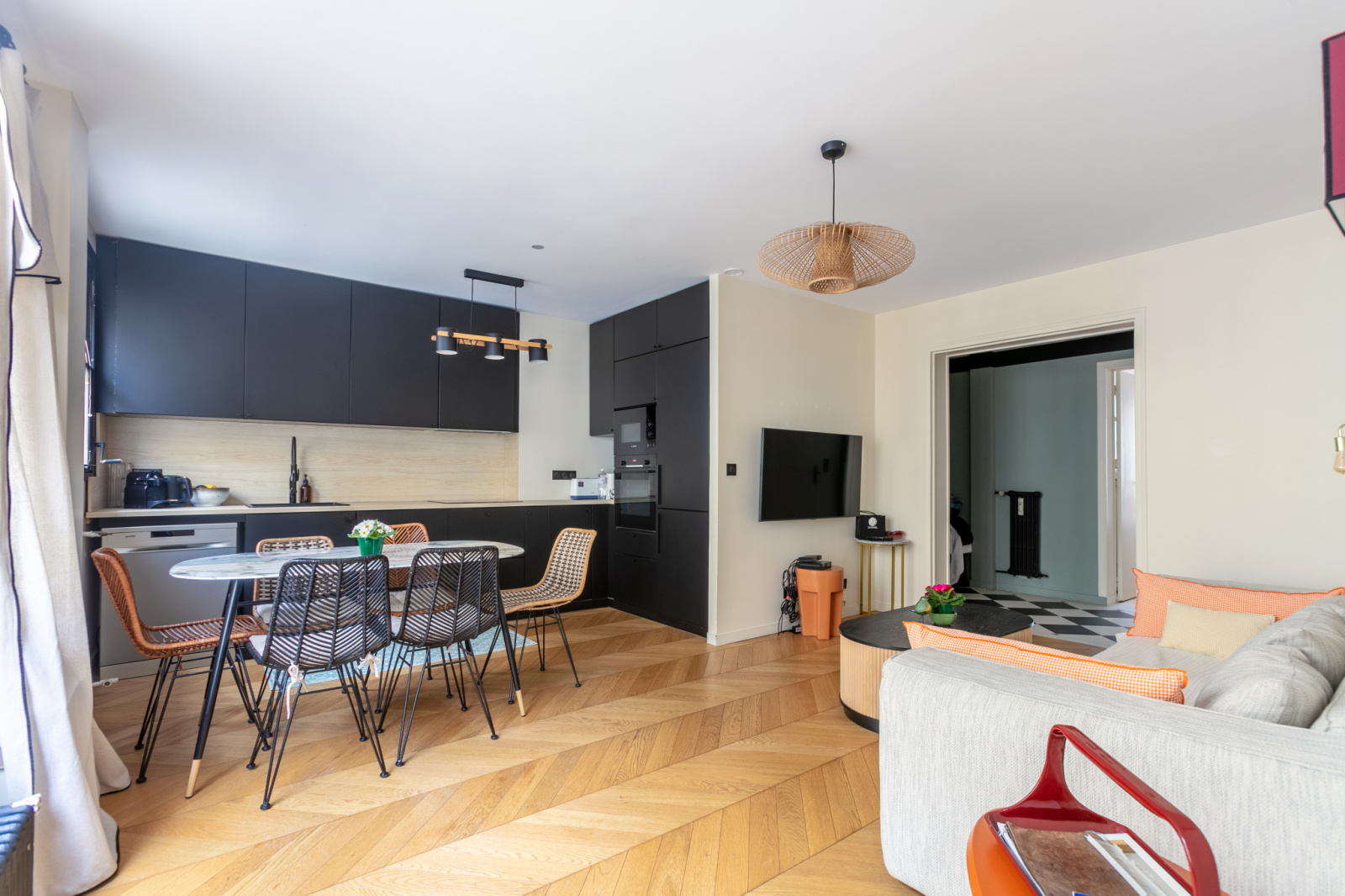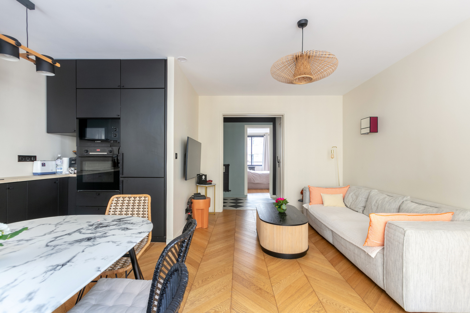 Le séjour accueille une cuisine ouverte aménagée et équipée, créant un espace de vie convivial et fluide. L’appartement dispose de deux chambres, l’une côté rue et l’autre côté passage arboré, offrant un équilibre agréable.